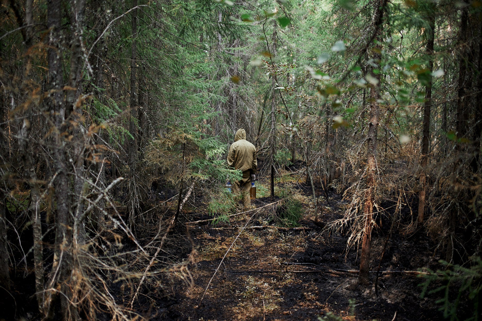 Андрей Федоров, житель райцентра Суоярви, почти каждый день ездит в Найстенъярви тушить пожар вместе с местнымиФото: Лиза Жакова для ТД Сейчас пожар продолжает вспыхивать. Земля покрыта тридцатисантиметровым слоем мха, который прогрелся до самого основания: жар идет под ним, и в случайных местах начинает дымиться. Время от времени может вспыхнуть целое дерево, выгореть целиком за каких-то пять минут и погаснуть, — пожарные называют это «свечкой». Пожар тушили всеми возможными способами: пускали встречный огонь, тушили с вертолетов, выкапывали минерализованные полосы, но лес продолжает дымиться.