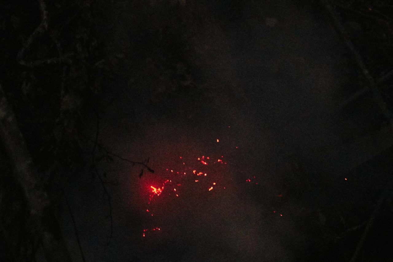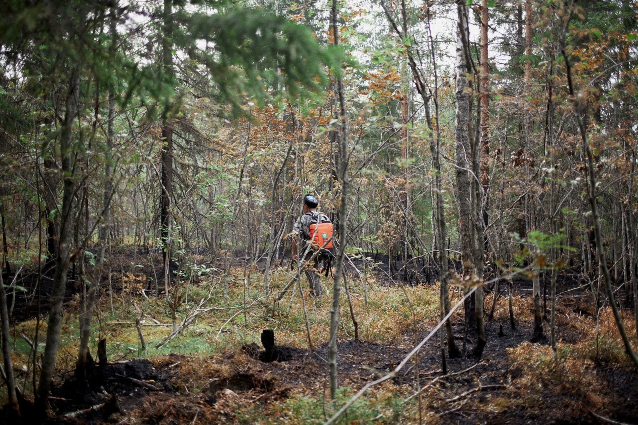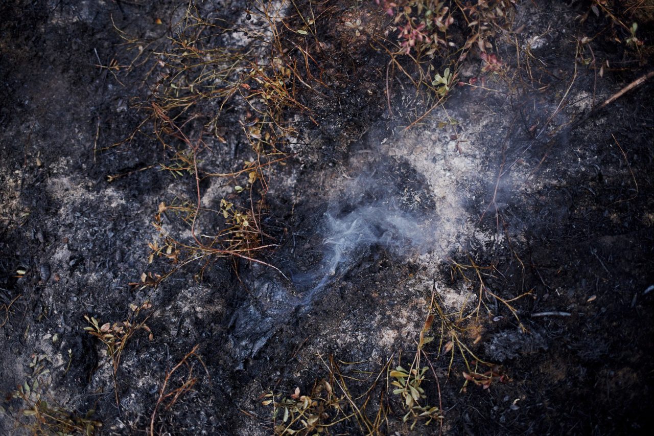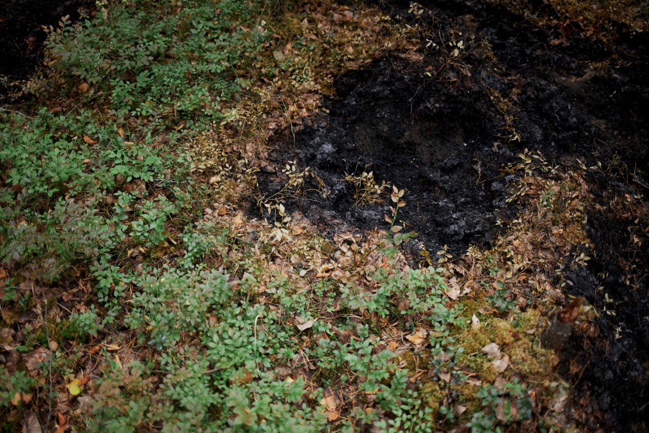 Выгоревший участок леса в окрестностях поселкаФото: Лиза Жакова для ТД Кто-то светит фонарем, кто-то тушит: главное — попасть из шланга в тот самый уголек, который дымит. Если он прогреется сильнее, пойдет открытый огонь, и в некоторых местах его уже видно. Первый очаг, следом второй и третий, к четвертому подхожу уже я и свечу в него фонарем. Видно, что он дымится сильнее и сильнее, а ранец сломался — шланг не работает.