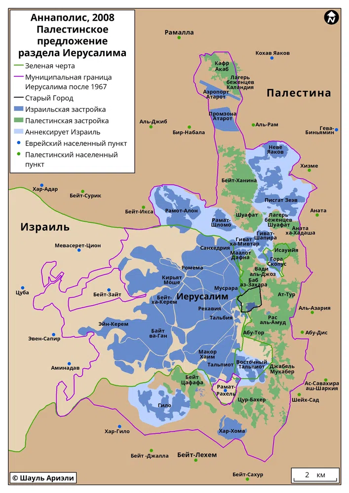 — Я публиковал свое предложение множество раз. Подчеркиваю, речь идет о разделе Восточного Иерусалима, аннексированного Израилем. Израилю отойдут 12 районов Восточного Иерусалима, в их числе Стена Плача, Еврейский квартал Старого города и гора Сион. В святых местах будет действовать особый режим, который обеспечит свободу доступа и свободу вероисповедания для приверженцев всех религий.