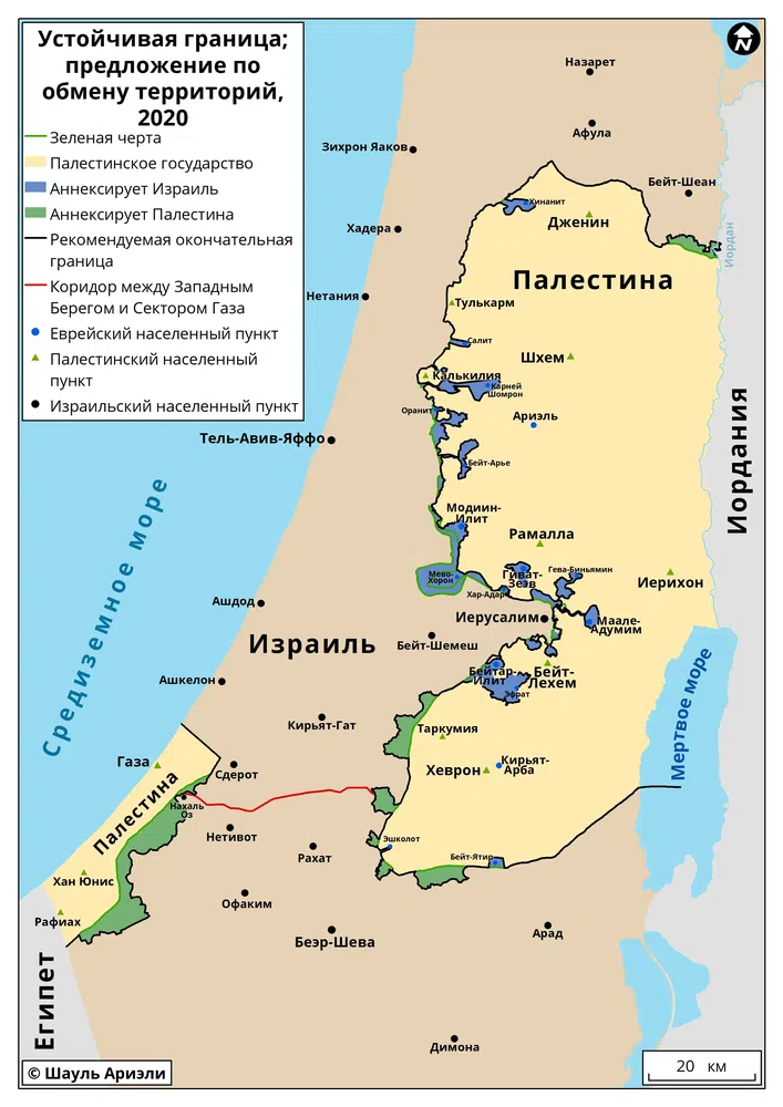 — Демилитаризованное государство в границах 1967 года со столицей в Восточном Иерусалиме, под контролем международных сил. В соответствии с 242-й резолюцией ООН. Произойдет четырехпроцентный обмен территориями, в результате чего около 80 процентов израильтян будут жить за «зеленой чертой» под суверенитетом Израиля.