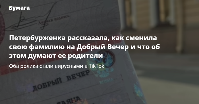 Петербурженка Даяна Карпова рассказала в TikTok, что недавно сменила фамилию на Добрый Вечер. Ролик девушки стал вирусным и набрал более 850 тысяч просмотров.