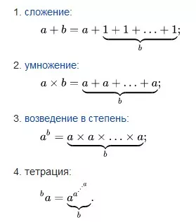 Запись — элегантнее некуда. Однако чтобы приблизиться к этому монстру, нужно разуметь особую запись больших чисел, предложенную американским ученым Дональдом Кнутом, — стрелочную нотацию. Она основана на том, что умножение всегда можно представить как многократное сложение, а возведение в степень — как многократное умножение. 3×4 — то же самое, что 3+3+3+3, а 34 = 3×3×3×3. В нотации Кнута возведение в степень обозначается одиночной стрелкой, направленной вверх: три в кубе (33) записывается как 3↑3, а гугол (он же 10100) — как 10↑100. Повторное возведение в степень записывается так: 3↑↑3 = 33^3. Это операция называется тетрацией («тетра-» — четыре и «итерация» — повторение) — четвертая после сложения, умножения и возведения в степень операция.