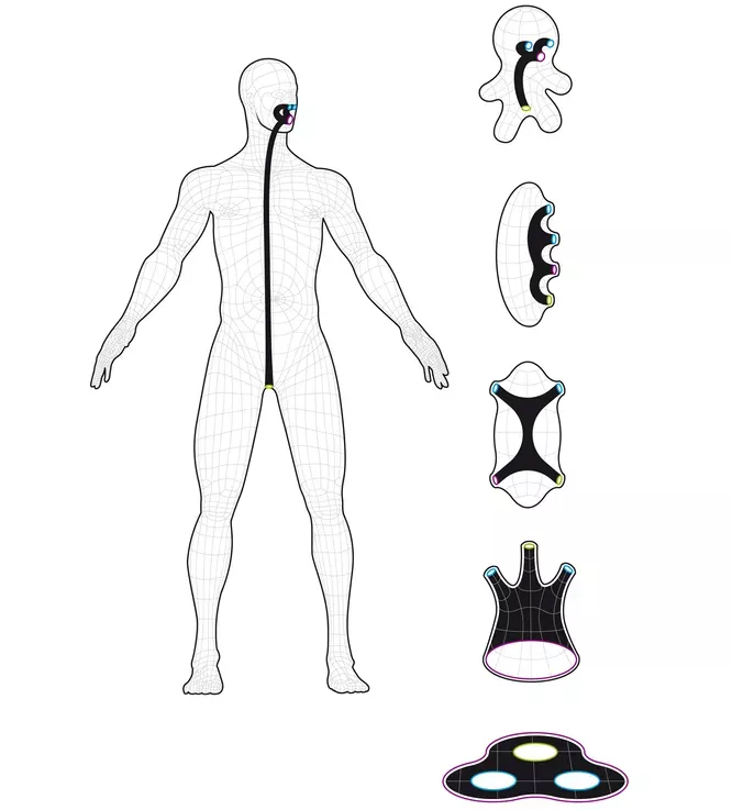 А человек, например, гомеоморфен спиннеру. С этой точки зрения уши и половые органы — это скорее впадины, потому что не сквозные и заканчиваются тупиками. Оставшиеся отверстия (вход/выход ЖКТ и ноздри) совмещаются, и мы видим на картине, что человек путем нехитрых манипуляций превращается в тройной тор — спиннер.
