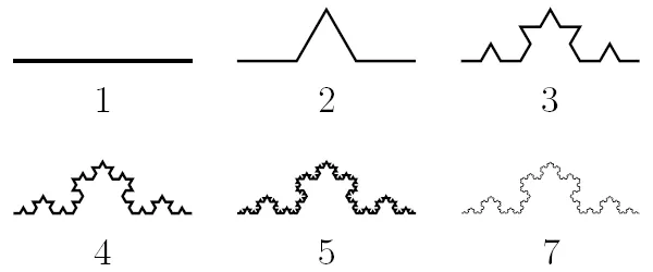Есть простые фракталы, такие как снежинка Коха или салфетка Серпинского. Делим отрезок прямой на три равные части, затем используем среднюю в качестве основания и строим на ней равносторонний треугольник, а потом его основание стираем. Повторяем процесс на каждом из получившихся четырех коротких отрезков, затем — на каждом из новых очень коротеньких отрезков и так далее.