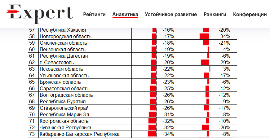 В этом рейтинге отстающие регионы отличаются от лидеров слабо развитой экономикой, низкой эффективностью бизнеса, зависимостью от федерального бюджета, низким уровнем благосостояния населения.