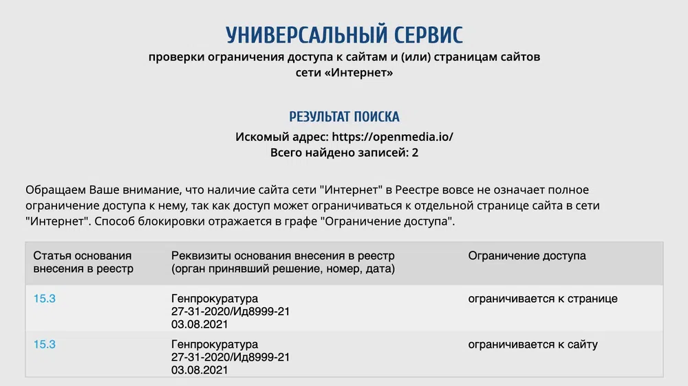 Издание обнаружило, что сайт «Открытых медиа» внесен в реестр интернет-страниц, содержащих «призывы к массовым беспорядкам, осуществлению экстремистской деятельности, участию в массовых (публичных) мероприятиях, проводимых с нарушением установленного порядка».
