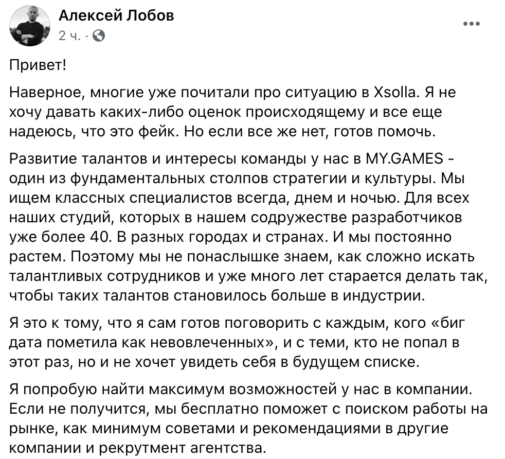 В пресс-службе Xsolla предоставили TJ комментарий Александра Агапитова. В нём он говорит, что «компании всегда необходимо быть в движении, чтобы выжить и стать лучше», из-за чего «приходится принимать непопулярные меры».