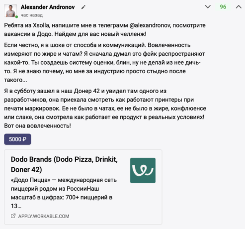 В комментариях на vc.ru с предложением вакансий в собственных компаниях выступили представители Dodo Pizza, Timeweb, Carrot quest, NBS Apps, «Лента» и другие.