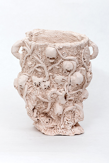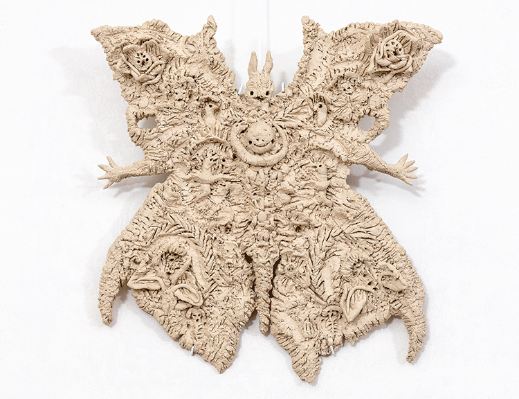 — Это новые работы, созданные специально для выставки «Мотылек и летучая мышь летят на свет». Это рефлексия, выраженная в физической материи. Я беру за основу большую тему, работаю над ней, делаю видео, инсталляцию. Я много общаюсь с людьми, слушаю, читаю их довольно тяжелые истории. Это люди, которые исключены из социума: например, транс-персоны, секс-работники, люди, которые подвергались насилию. Все эти истории я будто пропускаю через себя, пытаюсь их переварить. Керамика и живопись являются для меня как раз неким медитативным процессом. Это не побочный продукт, а неотъемлемая часть проекта. Скорее процесс исследования, нежели результат. И в керамических и живописных работах, представленных на выставке, этот процесс можно увидеть.