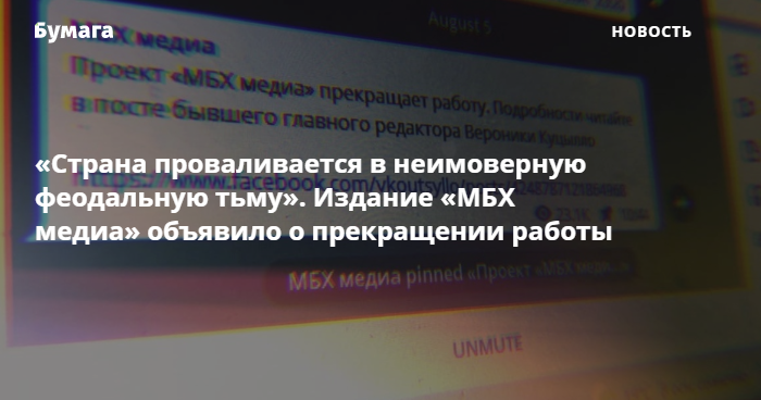 Издание «МБХ медиа» объявило о прекращении работы вслед за «Открытыми медиа» и «Правозащитой Открытки», сайты которых заблокировал Роскомнадзор. Заявление о закрытии выпущено в телеграм-канале проекта.