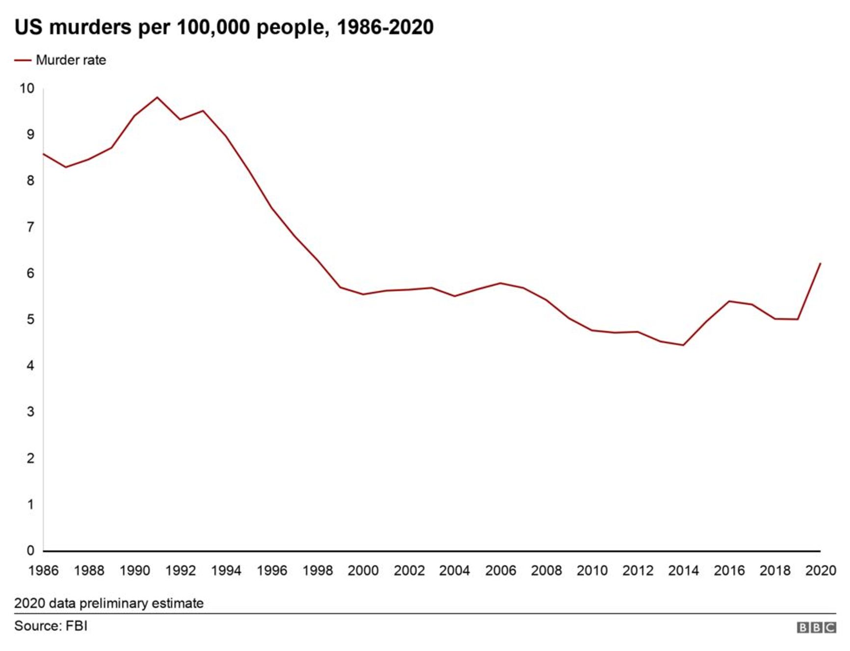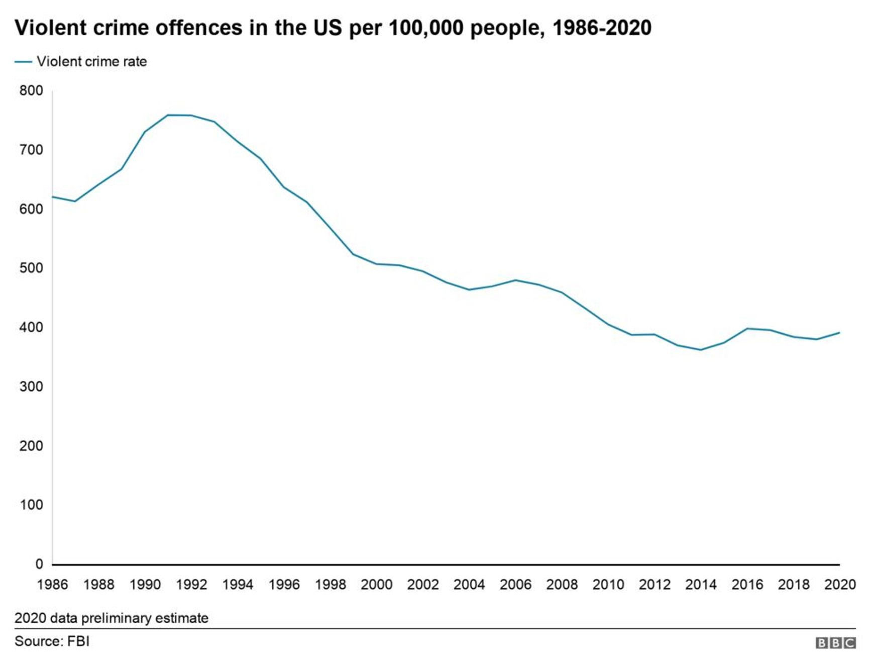 Корреспондент программы «Время» явно возрождает советский жанр репортажа из «страны желтого дьявола» о том, что там царят нищета и преступность и вообще невозможно жить. Но американская статистика не очень-то согласуется с мрачной картиной, которую он рисует. Количество насильственных преступлений на душу населения в стране было на пике в начале 1990-х и с тех пор устойчиво снижается, хотя в 2020 году и отмечен небольшой рост.
