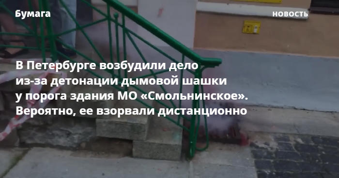 Дело из-за взрыва дымовой шашки у порога здания МО «Смольнинское»