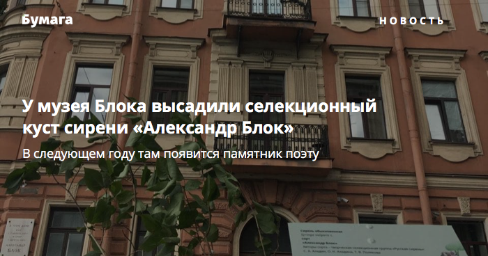 У музея-квартиры Александра Блока на улице Декабристов к 100-летию поэта высадили селекционный куст сирени, носящий его имя. Об этом 6 августа «Бумаге» рассказала представительница инициативной группы по установке памятника поэту Ольга Маркарян.