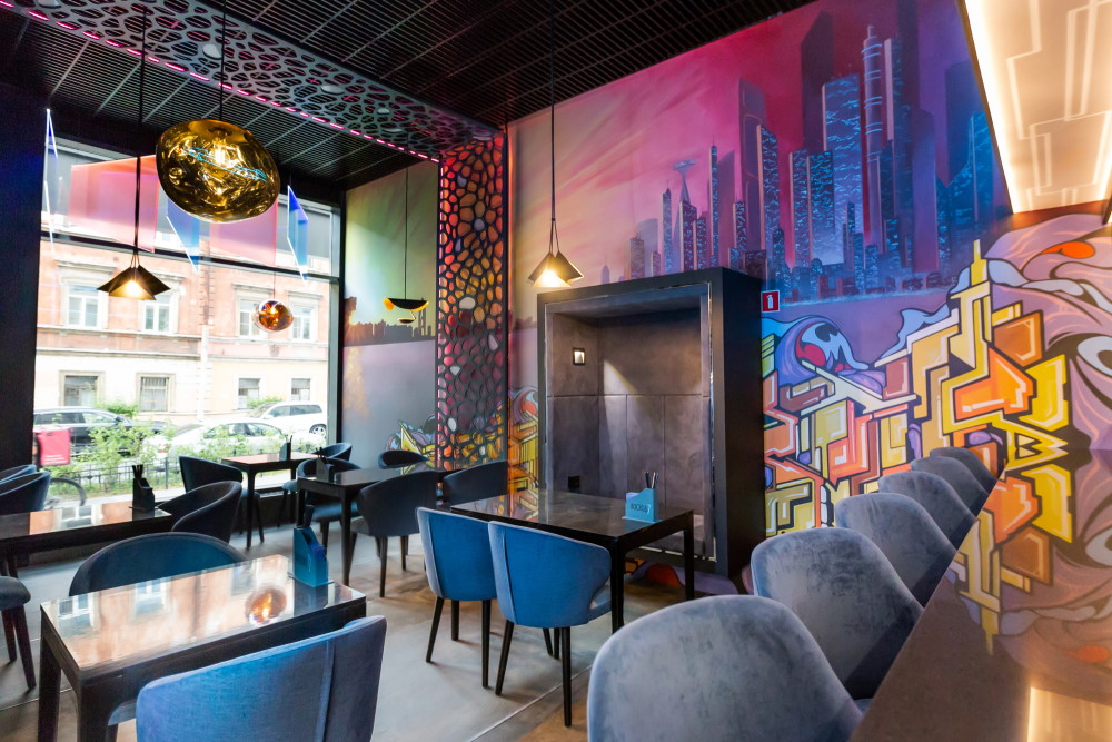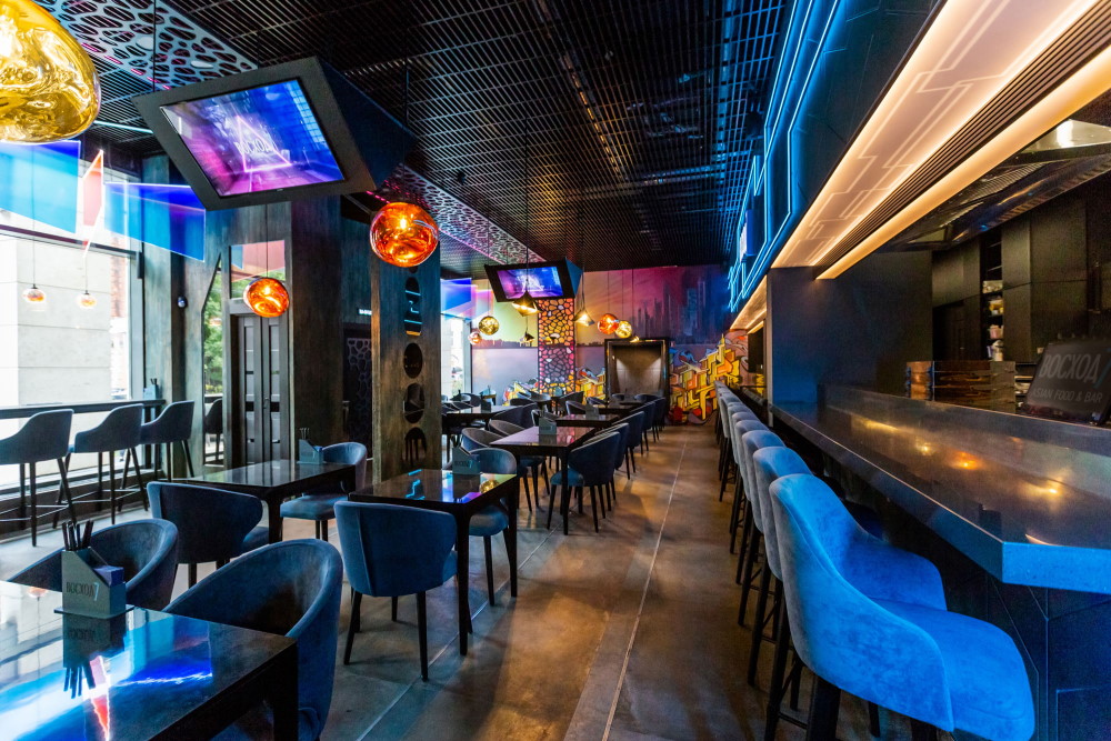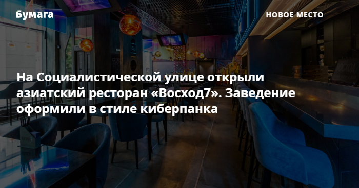 На Социалистической улице, 21 открыли ресторан азиатской кухни «Восход7», сообщили «Бумаге» представители заведения. Помещение оформили в стиле киберпанка, многие элементы оформления отсылают к космической тематике — например, раковина в виде осколка метеорита.