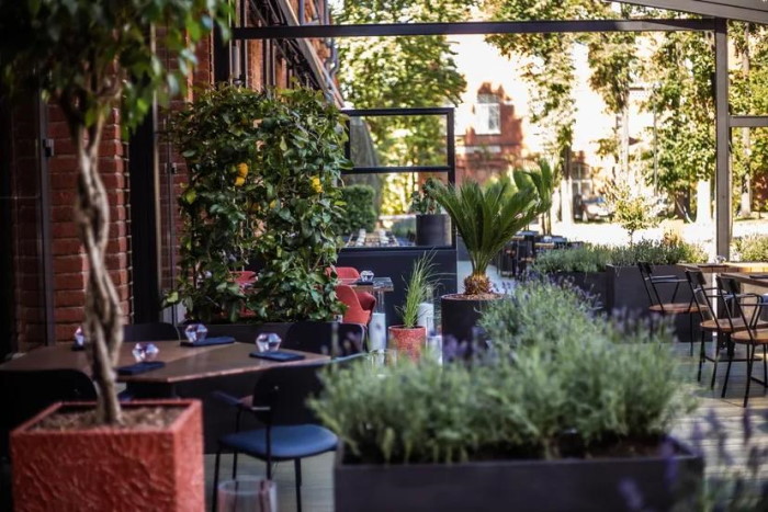 Еще одно зеленое летнее пространство предлагает петербуржцам ресторан «Сад» на Петроградской стороне. От довольно шумной Большой Зелениной террасу закрывает здание ресторана и забор, а внутри можно найти десятки живых растений — например, яблоневые деревья. На веранде подают блюда от шефа Андрея Красова: сейчас попробовать можно, к примеру, сезонную пасту с лисичками.