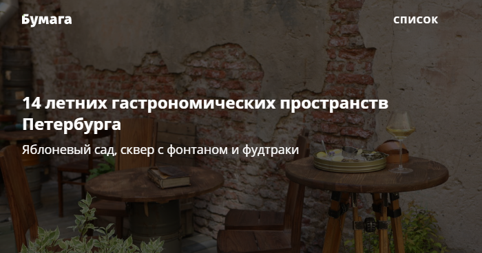Многие петербургские рестораны и кафе в этом году открыли сезонные поп-ап-проекты: летние дворы, зеленые террасы и большие общественные пространства. О некоторых из них «Бумага» уже рассказывала, а вот еще 14 площадок, которые помогут вам насладиться оставшимися летними днями.