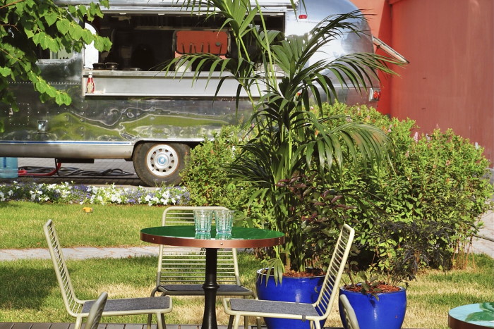 Пространство Giardino во дворе особняка Мясникова — сезонный уличный проект ресторана Salone pasta&bar. В зеленом саду установили уличную мебель и столики, а еду для гостей готовят в блестящем фудтраке. Акцент сделали на закусках и самых популярных позициях из меню ресторана: заказать можно тортелли с пармой, антипасти и другие блюда. Кроме того, посетителям предлагают коктейли от шеф-бармена Багратиона Гагуа — например, облегченную версию негрони сбальято.