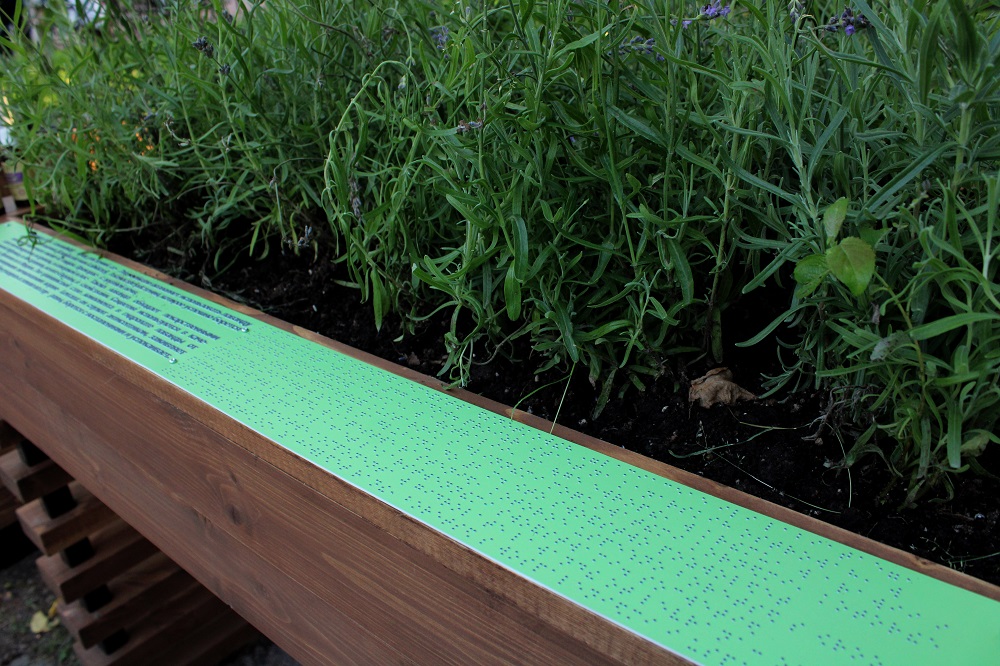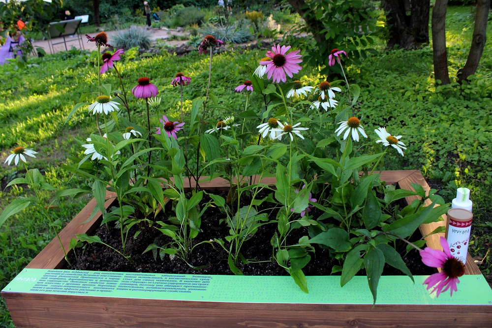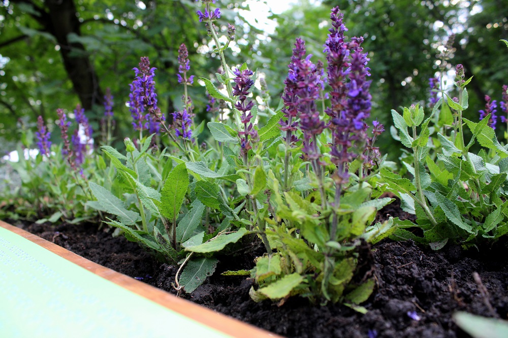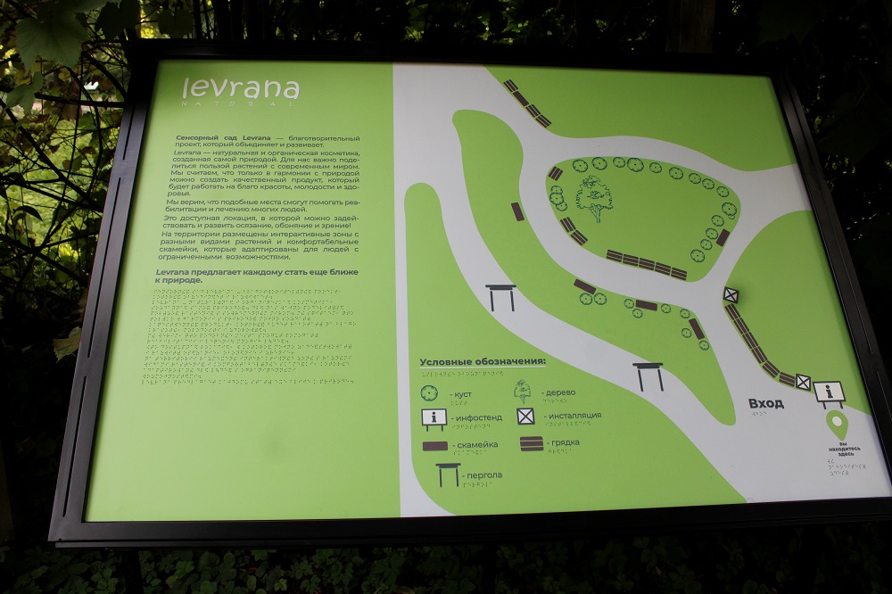 В саду представлены преимущественно лекарственные растения, которые можно трогать. Грядки растений приподняты над землей и оборудованы так, чтобы к ним можно было вплотную подъехать на коляске. Перед каждым растением установлено тактильное информационное описание со шрифтом Брайля.