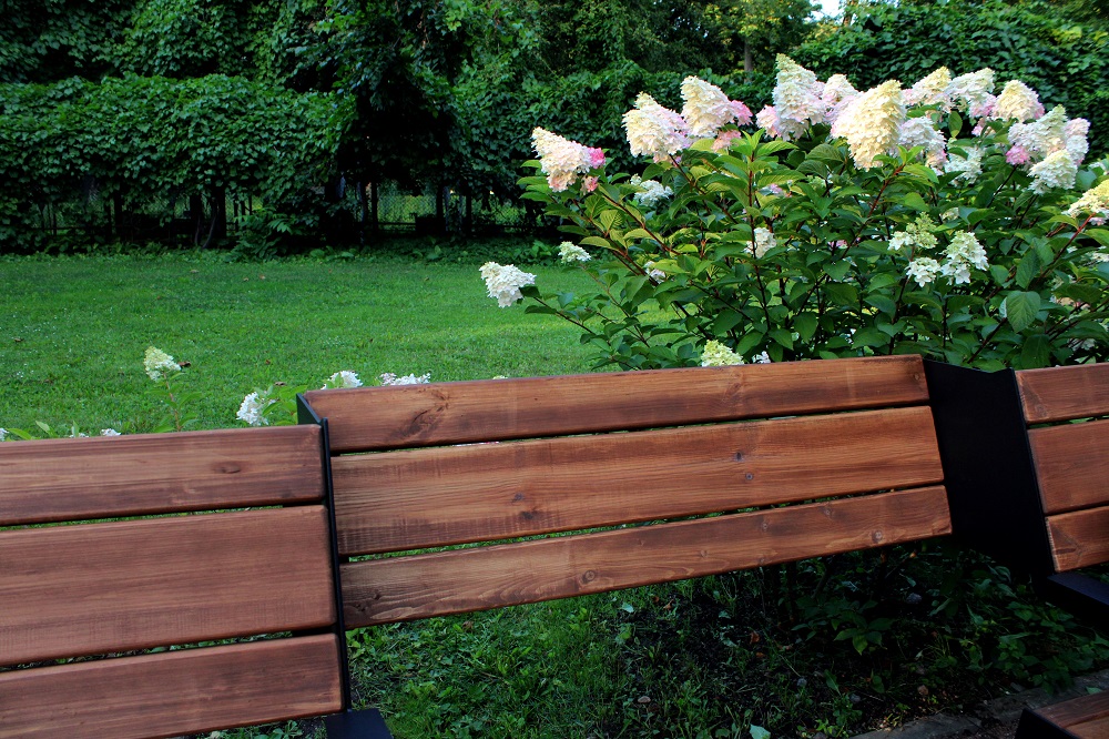 Помимо растений на территории сада есть скамейки для отдыха людей на колясках и их сопровождающих.