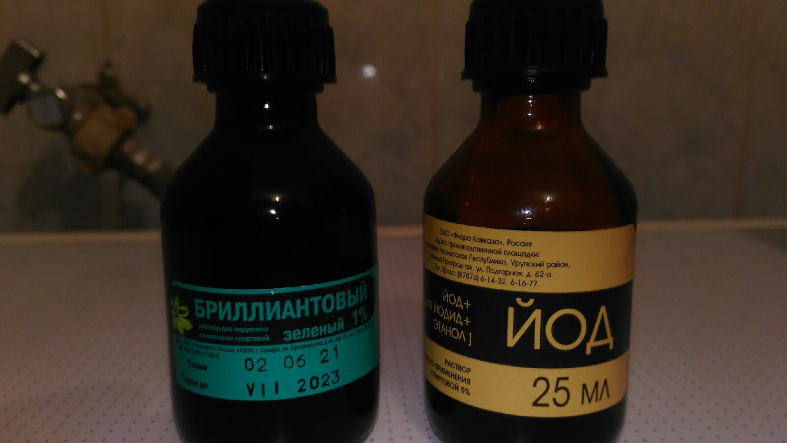 К тому моменту как я созрел, горячую уже отключили. Всё равно теплей, чем в речках и чище. Ага, только залез, ржавая пошла. Фиг с ней - голову мыть не буду. Вылез, надо раны обработать. Два одинаквых пузырька с йодом и зелёнкой, йод нормальный, а зелёнка наше всё. Крышечка отвинчивается, а там пробка пластмассовая. У йода она жёсткая, подцепил и открыл, у зелёнки мягкая и никак.