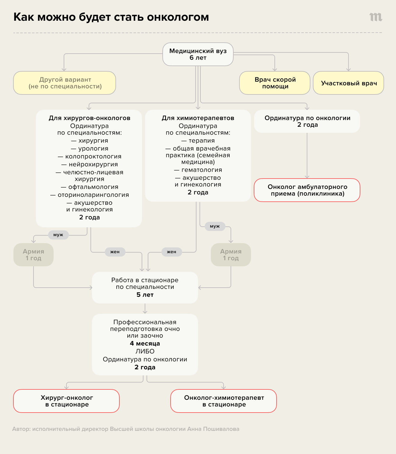 Путь человека, который хочет работать онкологом в стационаре, займет 15 лет, и есть сомнения в том, что многие будут готовы потратить столько времени для достижения этой цели. Если будущий онколог выберет курсы вместо ординатуры, то получить специальность он сможет немного быстрее, однако будут сомнения в качестве образования.
