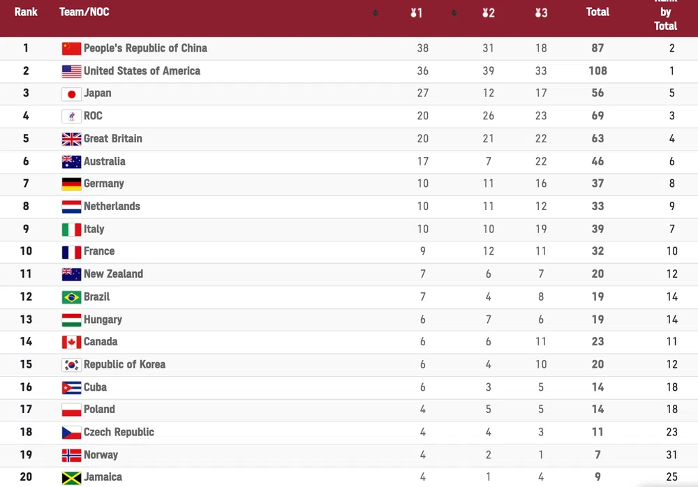 * Россия поднялась на четвертую строчку в медальном зачете. Первые три места занимают сборные Китая, США и Японии. На счету команды ОКР 20 золотых, 25 серебряных и 23 бронзовых медалей. На Олимпиаде в Рио-де-Жанейро в 2016 году россияне заняли четвертое место в медальном зачете, однако заработали только 19 наград высшей пробы.