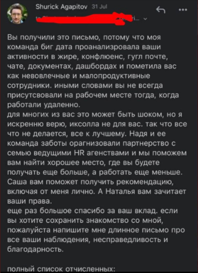 Скандал недели, который обсуждал весь технорынок (и не только): основатель единорога Xsolla Александр Агапитов уволил почти 150 сотрудников по итогам анализа их активности в рабочих чатах, почте и прочих сервисах. Сложно сказать, что вызвало большее возмущение: идея отбраковки сотрудников на основе активности в чатах, использование непрозрачного алгоритма или формулировки из письма Агапитова уволенным. Но сама по себе слежка за сотрудниками и массовые увольнения тех, кто сочтен неэффективными, — совсем не новость.