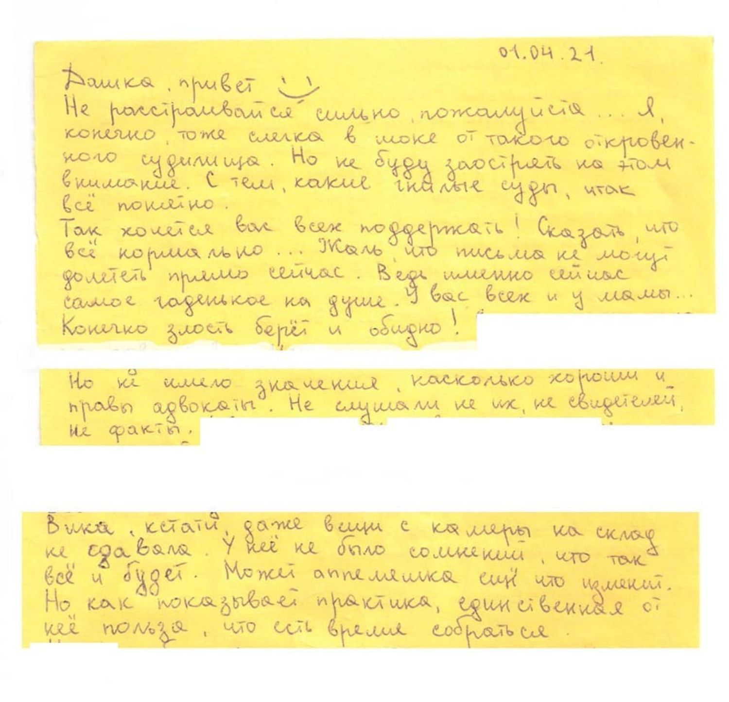 На территории лагеря я уже посмотрела на ели, березы и еще три вида деревьев! Но такое ощущение, что они и сами заключенные. Как-то тоскливенько на них смотреть, хотя они и прекрасны. Другое дело — деревья, фонари, деревни, города и дали из окна Столыпина [вагона во время этапирования]. Хочется любоваться пейзажами свободы».