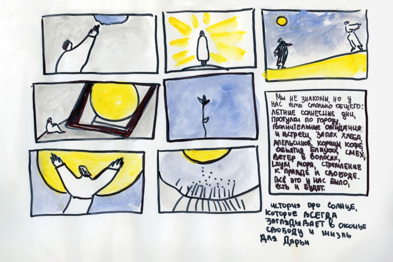 Это письмо от Ольги из Минска было отправлено в июне 2021-го Дарье Чульцовой — журналистке, осужденной за стрим, который она вела с акции протеста. Ольга пояснила «Медузе», что в письме есть «пасхалка» — изображение солнца, которое отсылает к названию первого независимого белорусского издательства «Заглянет солнце и в наше оконце». Пишет Ольга и другим политзаключенным: «Я все время думаю: они сидят и мне надо как-то жить за них всех. День проводишь с мыслью, что бы им написать, что они пропустили. Они не видели весну и лето. Многие — как растут дети. Хочется это всем передать».