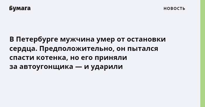 В Петербурге мужчина умер от остановки сердца. Предположительно, он пытался спасти котенка, но его приняли за автоугонщика — и ударили
