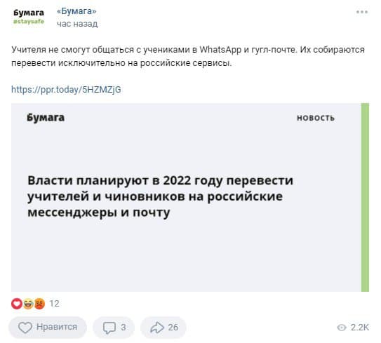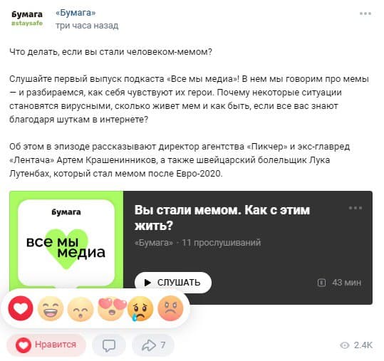 «ВКонтакте» добавила реакции и теперь публикации в ленте можно оценивать не только лайками, говорится в официальном заявлении социальной сети. У некоторых сотрудников «Бумаги» уже доступна эта функция — показываем интерфейс.
