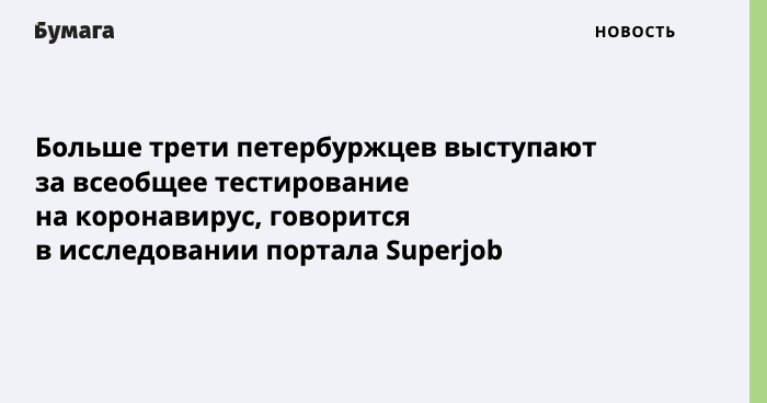 Больше трети жителей Петербурга считают необходимым всеобщее тестирование горожан на коронавирус. Об этом «Бумаге» сообщили аналитики Superjob. Они опросили 1,6 тысячи «представителей экономически активного населения города», говорится в исследовании.