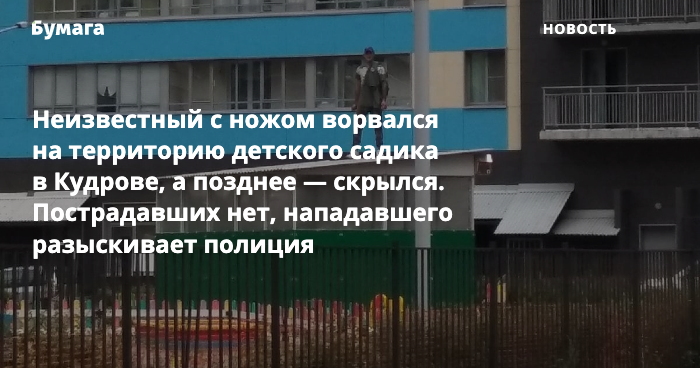 В Кудрове неизвестный ворвался на территорию частного детского садика с ножом, сообщают очевидцы в сообществе «Жизнь в Кудрово».