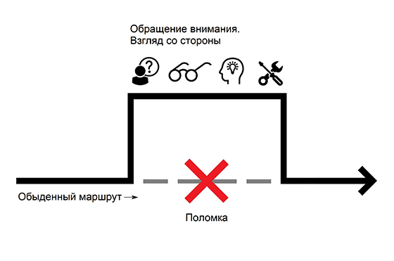 Поломка может обнаруживаться не только в предмете, но и в ситуации, смысле и т.д. Труп на улице, собирающий вокруг себя охающих зевак, которые готовы перейти улицу, чтобы посмотреть, что там случилось, — это тоже поломка. Она нарушает привычку, сдвигает намерения, паразитическим образом встраивается в сознание, кроме этого, создает затор на тротуаре, который меняет движение потока людей.