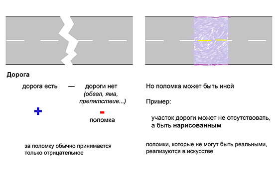 Здесь, как и в случае с авангардом, поломка просит рассматривать ее в отношении к закостенелому социальному и культурному устройству. Большее понимание нам дают дадаизм и сюрреализм, чьи радикальность и иррационализм способны не просто силой остановить поезд на рельсах истории, чтобы сменить локомотив, а вообще переместиться на другие рельсы. Поломка часто, а может, и всегда связана с некоторым сдвигом относительно оси диалектического противоречия. То есть она существует вне чистой оппозиции, она не позволяет отдельному произведению искусства быть свернутым, разрешенным, нечто остается нередуцируемым, недосказанным. Это трудно схватить, оно ускользает.