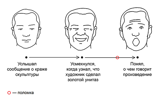 © The Solomon R. Guggenheim Foundation Маурицио Каттелан. Америка. 2016 Данная проблема нуждается в отдельном обсуждении и не терпящих отлагательства действиях. Но я обращусь только к методу поломки, который работает уже сейчас. Вспомните сообщения о краже золотого унитаза Каттелана. Комментарии о происшествии, биография художника, интерпретации растворяются перед образом. В бытовом обсуждении новости можно было видеть, как ироничные улыбки собеседников по поводу объекта быстро, словно по щелчку пальцев, сменяются пониманием и чувством социальной неудовлетворенности, за чем сразу выстраивается ряд аргументов.