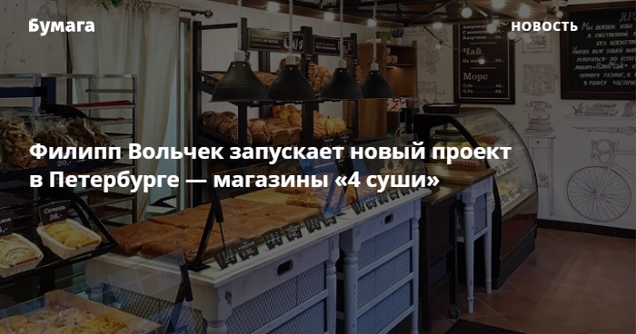 Основатель «Булочных Ф. Вольчека» Филипп Вольчек планирует запустить в Петербурге магазины «4 суши». Об этом сообщает «Коммерсантъ» со ссылкой на несколько источников, среди которых есть сотрудник компании.