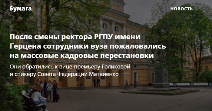 После смены ректора РГПУ имени Герцена сотрудники вуза пожаловались на массовые кадровые перестановки. Они обратились к вице-премьеру Голиковой и спикеру Совета Федерации Матвиенко