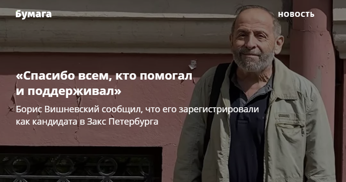 Борис Вишневский подал документы в ТИК № 30, чтобы его зарегистрировали как кандидата в Закс Петербурга. Там политику отказали якобы из-за неточностей в оформлении документов. Вишневский говорил «Бумаге», что это был «политический заказ городской администрации <…>, чтобы обеспечить победу «Единой России». Позже ГИК отменил решение о снятии Вишневского с выборов.