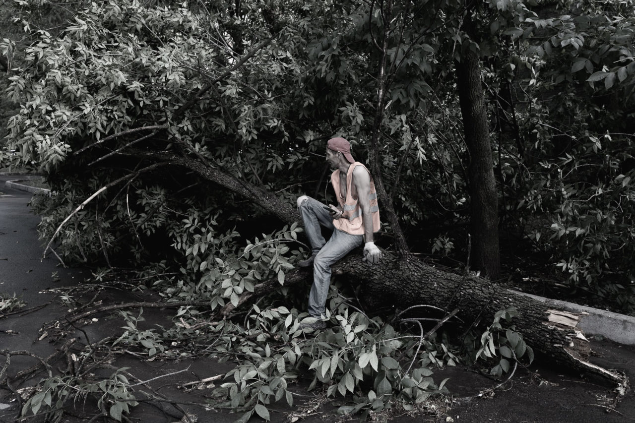 Юра сидит на поваленном ураганом дереве. Все дворники связаны чатом в вотсапе, куда скидывают фотографии чрезвычайных происшествий на районе. Через полчаса приедет трактор и утащит обломок дерева, а плотник допилит опасно надломленные ветвиФото: Вадим Брайдов для ТД «Но теперь-то ты с нами, Юра, — гладила его по руке Бабаня. — Свободный диван есть, оставайся, а завтра что-нибудь придумаем».