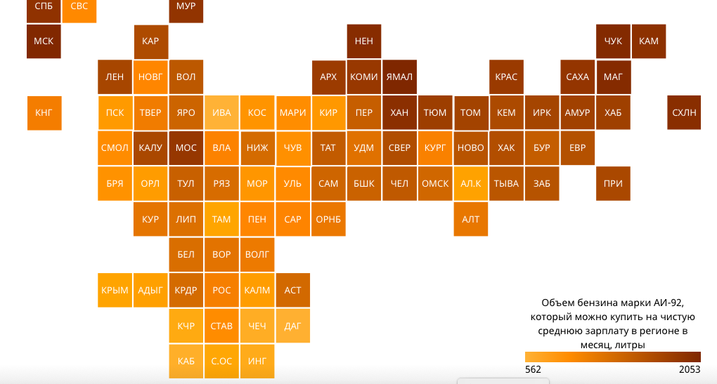 Лидерами по доступности бензина стали, как и ранее, Ямало-Ненецкий автономный округ и Москва, где на среднюю зарплату можно купить более 2 тысяч литров бензина марки АИ-92 в месяц. В пятёрке лидеров также Чукотский автономный округ, Магаданская область и Ненецкий автономный округ, где жители могут купить более 1,5 тысячи литров 92-го бензина в месяц.