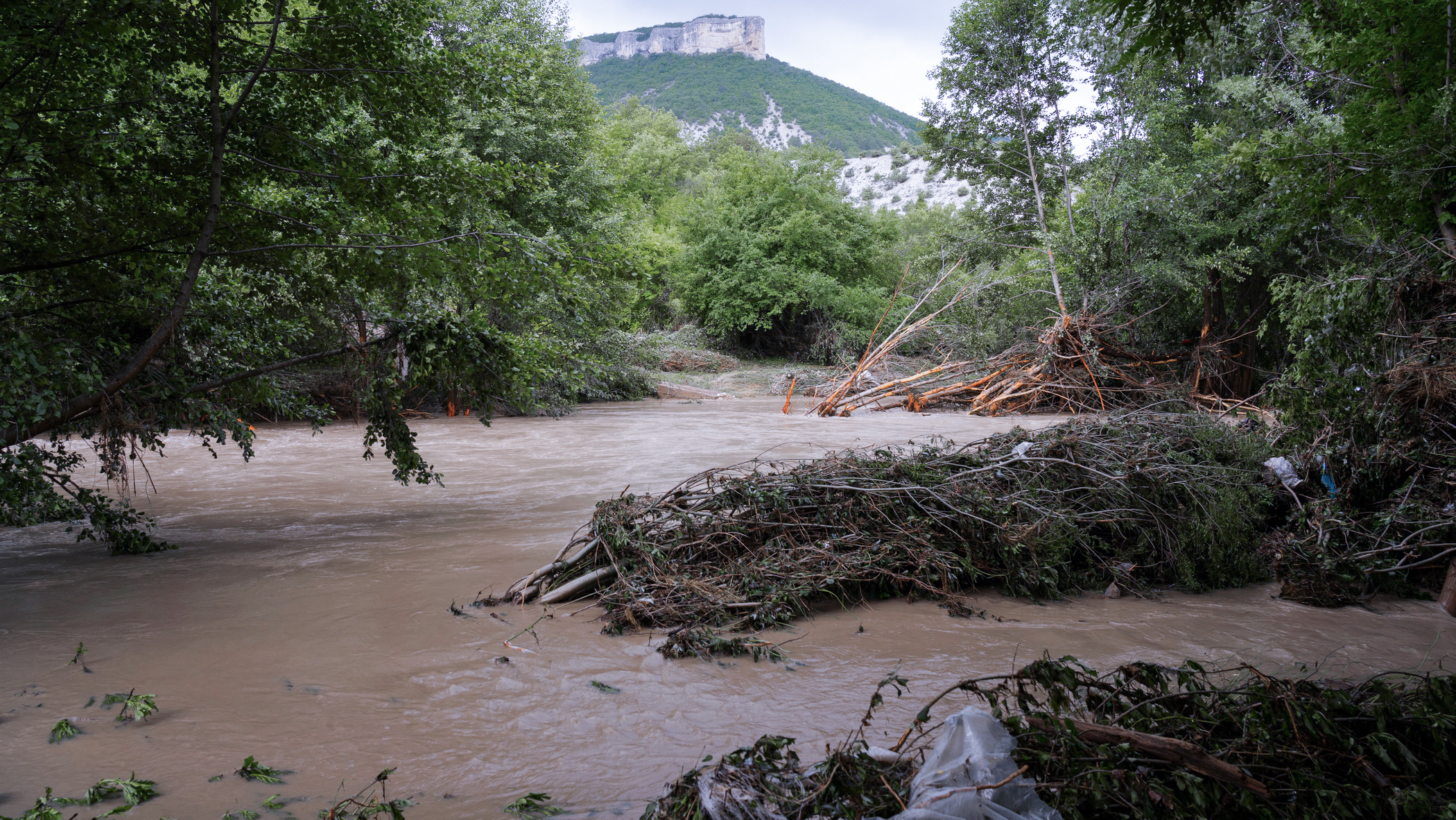 «В 20:30 на телефон доверия ГУ МЧС России по Республике Крым поступила информация о сильном дожде в районе с. Краснолесье Симферопольского района. По предварительной информации в результате перенаполнения природного естественного водоема происходит сход воды на автодорогу между с. Краснолесье и с. Доброе. Затруднено движение автотранспорта», – говорится в сообщении.