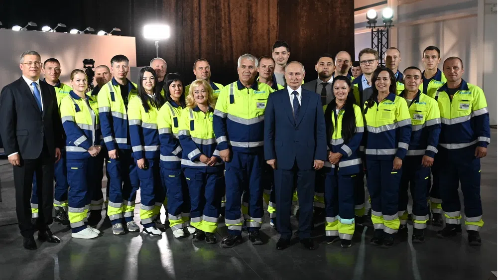 Сразу после торжественного открытия Путину устроили экскурсию по заводу, а затем состоялась встреча с «простыми сотрудниками» «Цемикс». Около двадцати человек в желто-синей спецформе рабочих сели перед президентом, чтобы задавать ему вопросы. Первыми выступили гендиректор «Цемикс» Самат Тарыбаев и его заместительница Залия Сиргалина, которые благодарили Путина за приезд. После их вопросов даже президент отметил, что на встрече «собрали одно начальство». Затем слово дали Гузель Янбердиной, на которой была форма рабочих завода. На сайте администрации района ее должность обозначена, как «главный инженер отдела капитально строительства», правда, о том, что этот отдел никакого отношения к заводу не имеет, женщина не упомянула. Гузель Янбердина — сотрудница районной администрации, и отдел также является частью администрации. Она спросила Путина о том, когда на олимпиаде будет снова звучать российский гимн. Затем слово дали заместителю директора ООО «Медиасервис», которое тоже отношения к заводу не имеет. Следующий вопрос задавала Розалия Булатова, еще одна сотрудница администрации, одетая в форму рабочих завода. Девушка спросила, когда будет закончена газификация местных районов. После нее еще одна работница ООО «Медиасервис» узнала у Путина, нравится ли ему местный мёд.