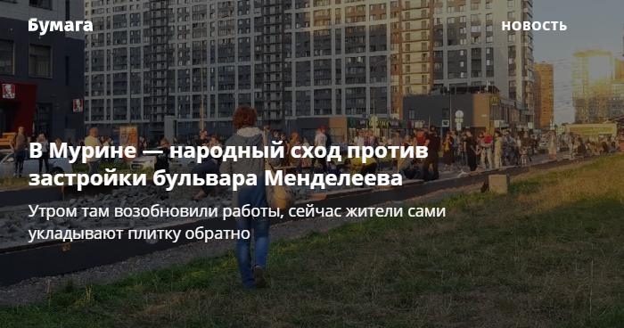 В Мурине уже не менее двух лет протестуют против застройки бульвара Менделеева. В 2019 году компания «Мавис» намеревалась построить здесь кафе с шавермой, но работы остановили после митинга местных жителей. Сейчас участком владеет компания «Рента Инвест», которая пытается возвести ресторанный молл.