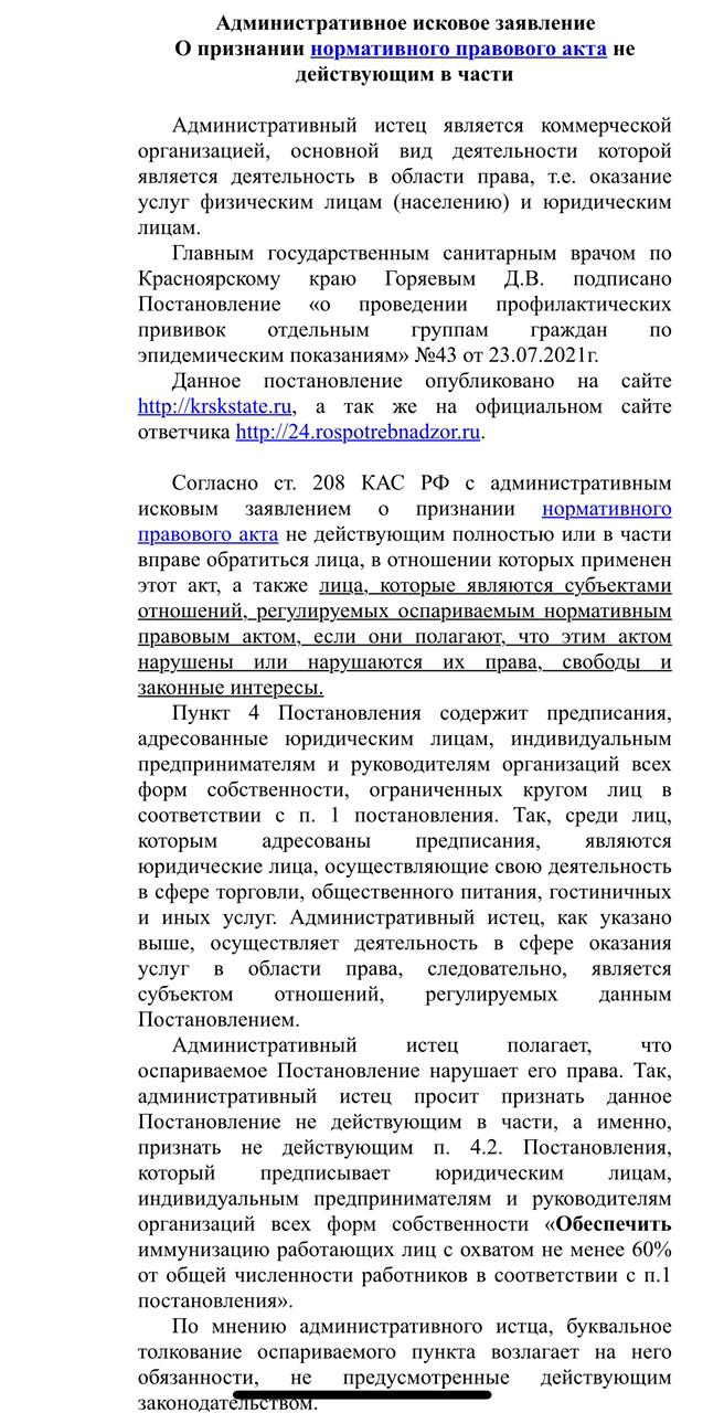 Поэтому вопрос в другом: обязывать предпринимателей и руководство предприятий заниматься принуждением и контролем за вакцинацией – это прямое нарушение нескольких законов (в моем исковом на 7 страницах расписаны все нормативные акты, что были нарушены одним постановлением). Иск с требованием отменить постановление санитарного врача, кстати, подан от имени одной из компаний края. Предприниматель не хочет лишнего внимания властей и надзорных органов, поэтому просит название компании пока не указывать, – объясняет Напольских.