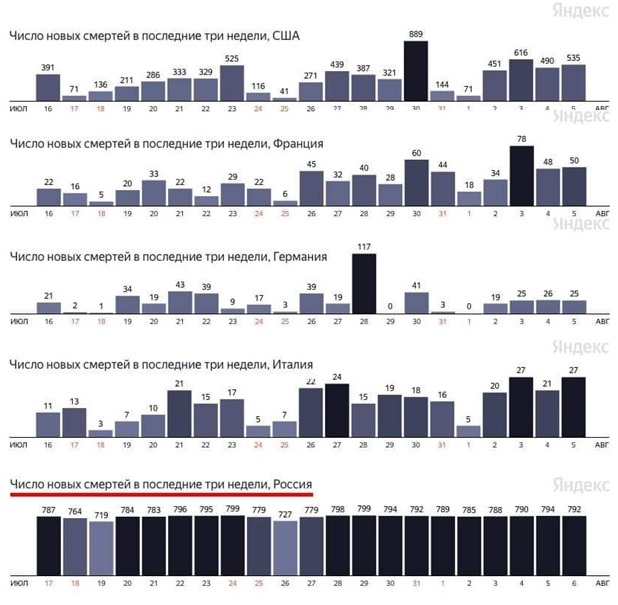 Вот посмотрите, как выглядят данные по смерти от COVID-19 по дням в разных странах. Одного взгляда на график достаточно, чтобы понять, сколько в РФ разрешили сообщать о числе смертей в день.