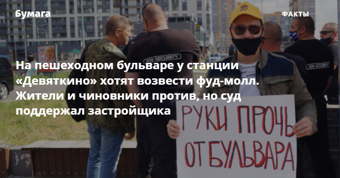 На пешеходном бульваре у станции «Девяткино» хотят возвести фуд-молл. Жители и чиновники против, но суд поддержал застройщика
