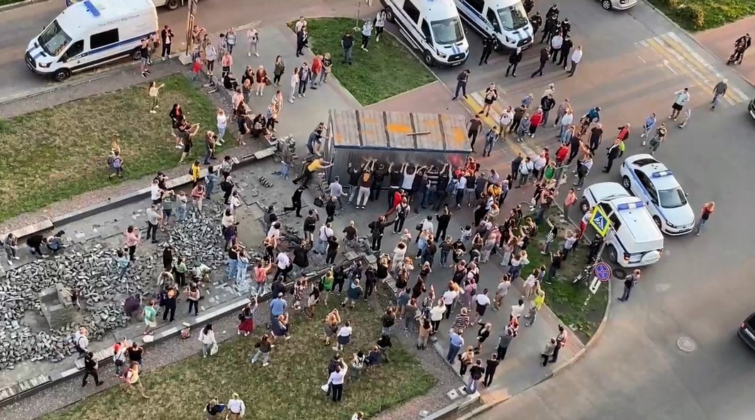 В Мурино местные жители остановили работы по строительству фуд-молла. Застройщик разобрал плитку на бульваре Менделеева, однако люди огороди стройплощадку забором, отодвинули строительный вагончик и положили плитку на место. Видео и фотографии с места событий опубликованы в сообществе "Инфраструктура Западного Мурино" в соцсети "ВКонтакте". На кадрах видно, что полицейские не вмешиваются в происходящее.
