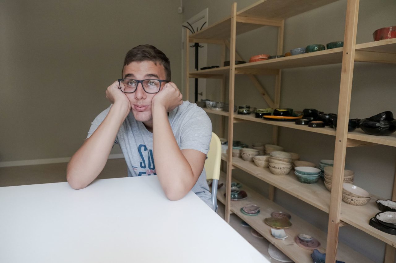 Даня в шоуруме Творческого объединения «Круг»Фото: Юлия Скоробогатова для ТД Сотрудники мастерской делают открытки, керамику, варят мыло, рисуют, шьют, создают украшения — и получают за это зарплату.