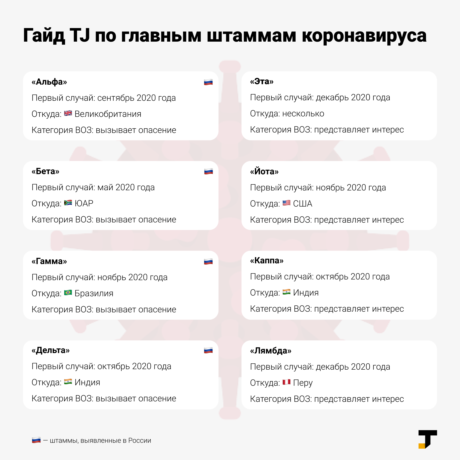 Сейчас ВОЗ наблюдает за восемью вариантами Covid-19, разделёнными на два списка — «вызывающие опасения» и «вызывающие интерес». В первый входят штаммы «Альфа», «Бета», «Гамма» и «Дельта», во второй — «Эта», «Йота», «Каппа» и «Лямба». TJ рассказывает, что известно о каждом.